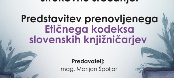 Spoštovani, Društvo bibliotekarjev Koroške v sodelovanju s Koroško osrednjo knjižnico vabi na strokovno srečanje »Predstavitev prenovljenega Etičnega kodeksa slovenskih knjižničarjev«. Prenovljeni Etični kodeks bo predstavil vodja delovne skupine za pregled EKSK, mag.Preberi si več …